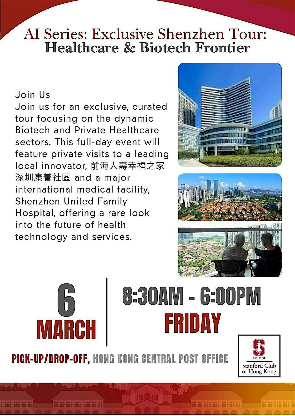 Join us for an exclusive, curated tour focusing on the dynamic Biotech and Private Healthcare sectors. This full-day event will feature private visits to a leading local innovator, 前海人壽幸福之家深圳康養社區 and a major international medical facility, Shenzhen United Family Hospital, offering a rare look into the future of health technology and services.