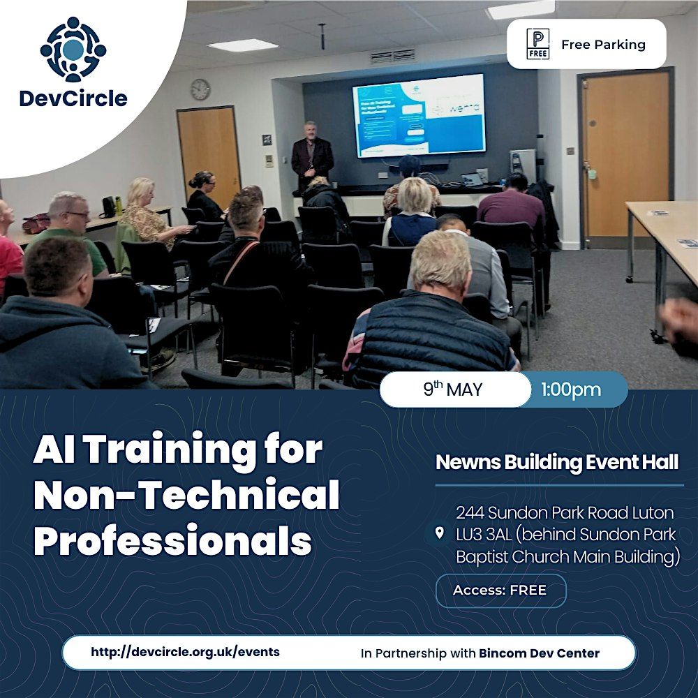 My Development Circle brings you this free AI training in partnership with Bincom Dev Center at Newns Building , 244, Sundon Park Road, Luton LU3 3AL (behind Sundon Park Baptist Church Main Building).