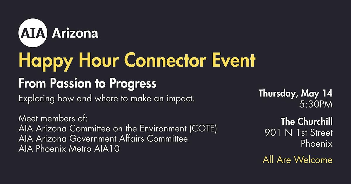 All are welcome to join AIA Arizona Committee on the Environment (COTE), AIA Arizona Government Affairs Committee, and AIA Phoenix Metro AIA10 for a happy hour connector event on Thursday, May 14 at the Churchill in Phoenix. This informal gathering will bring together individuals who are passionate about sustainability and community impact.