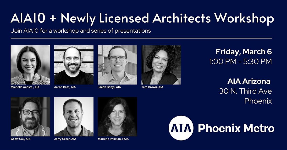 All members of AIA are welcome to this event, presented by AIA10 of AIA Phoenix Metro. The lineup of experienced professionals will tackle the topics that matter most right now: protecting yourself from professional liability with Marlene Imirzian, FAIA; understanding money management in architecture with Jacob Benyi, AIA; exploring the transition from career growth to leadership with Michelle Acosta, AIA; and strategies for overcoming collaboration conflicts and building stronger, more effective working relationships with Tara Brown, AIA. The day will also include a dynamic panel featuring Jerry Greer, AIA, Aaron Bass, AIA, and Geoff Cox, AIA, who will dive into alternate career paths within and beyond traditional practice, offering perspective on the many ways an architectural education can evolve.