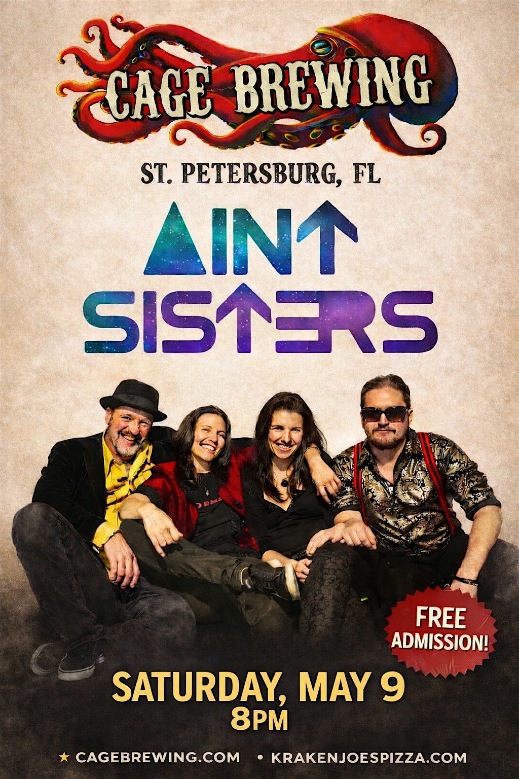Join us in St. Petersburg, FL for an awesome night with AINT SISTERS! This killer band all the way from Georgia will be rocking the stage on Saturday, May 9 starting at 8pm. It’s an in-person event, so come hang out, enjoy great vibes, and catch some live FUN FOLK ROCK at the cozy Cage Brewing spot. Don’t miss out on this laid-back evening filled with good music and good company! Bring your appetite for some Kraken Joe's Pizza, Cage's own pizzeria bringing you the FLAVOR!