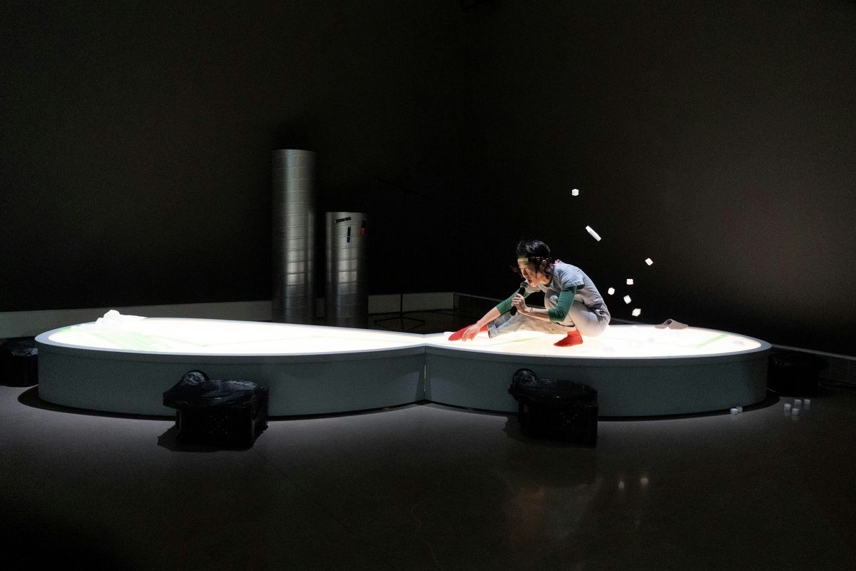 Aki Sasamoto, Point Reflection, 2023–2024. Performance at the Queens Museum. Photo courtesy of the artist and Queens Museum. Credit Hai Zhang.