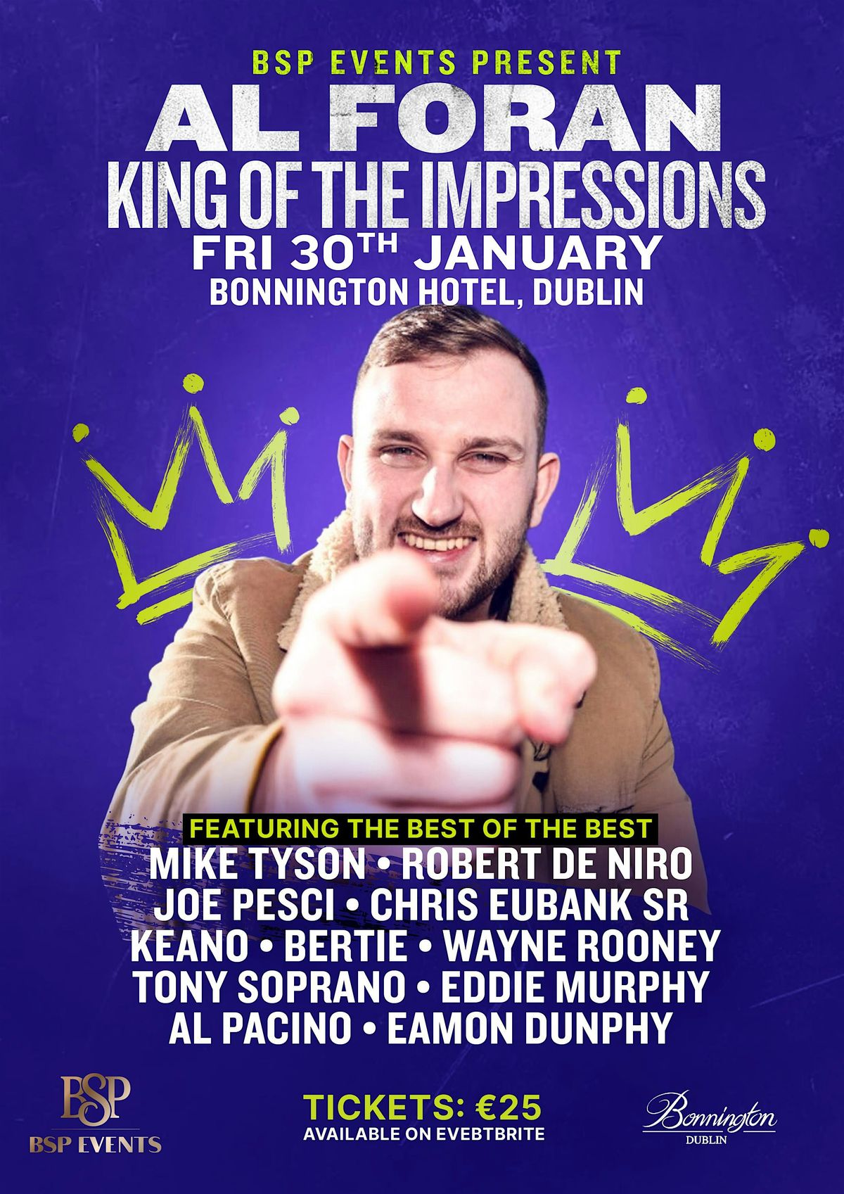 Get ready for an unforgettable night with Al Foran, the King of Impressions performing live at the Bonnington Dublin Hotel! Join us in person for a fun-packed evening full of spot-on celebrity impressions and loads of laughs. Don’t miss out on the chance to see Al’s incredible talent up close in a relaxed and friendly atmosphere. Come along, bring your friends, and enjoy the show!