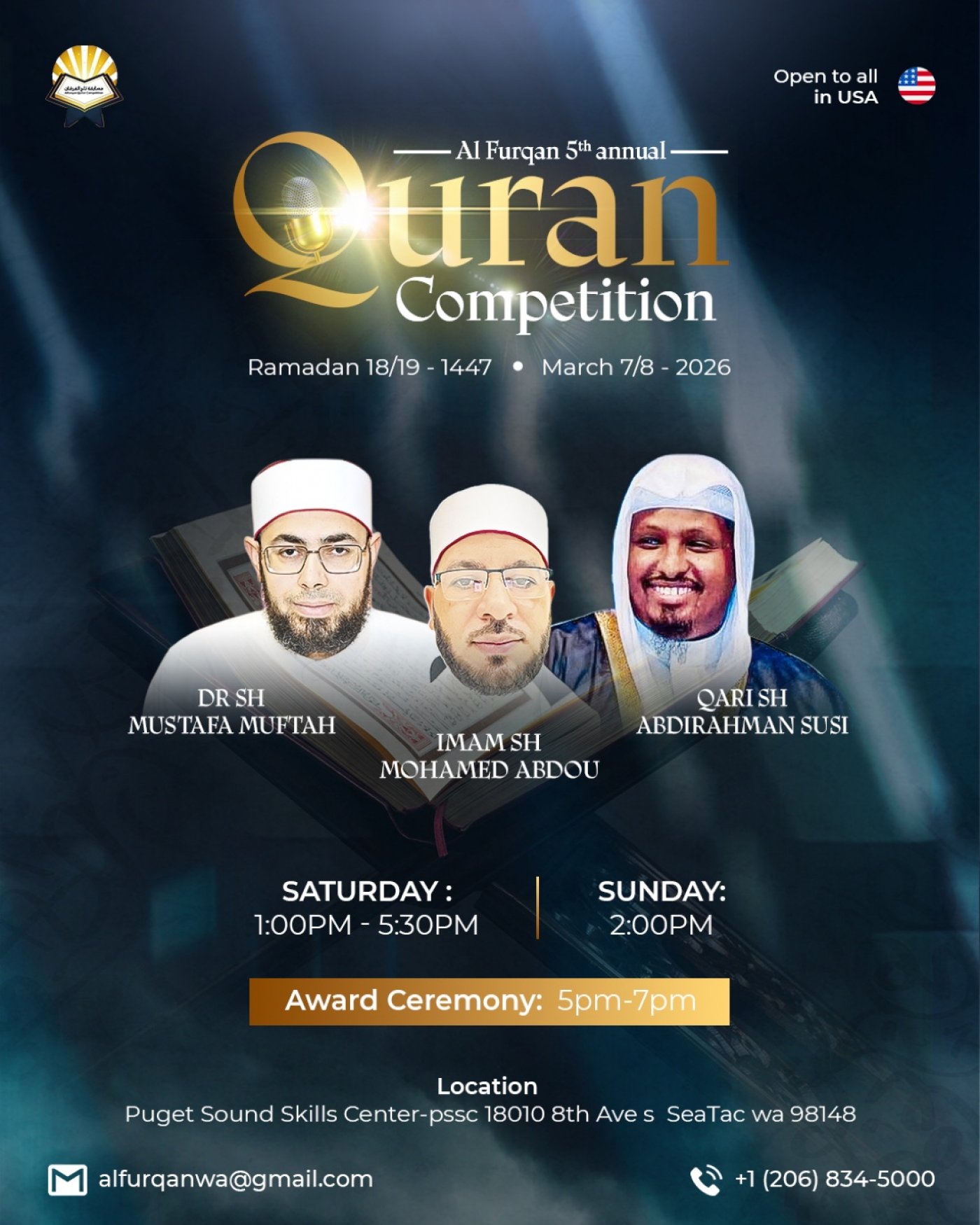 The Taj Al-Furqan Competition is an annual event held across the United States, with its main headquarters in Seattle, Washington. The competition takes place every year during the blessed month of Ramadan. It aims to encourage the memorization, recitation, and understanding of the Holy Qur’an, instill Qur’anic values in participants, and promote a positive spirit of competition while strengthening their connection to the Book of Allah.