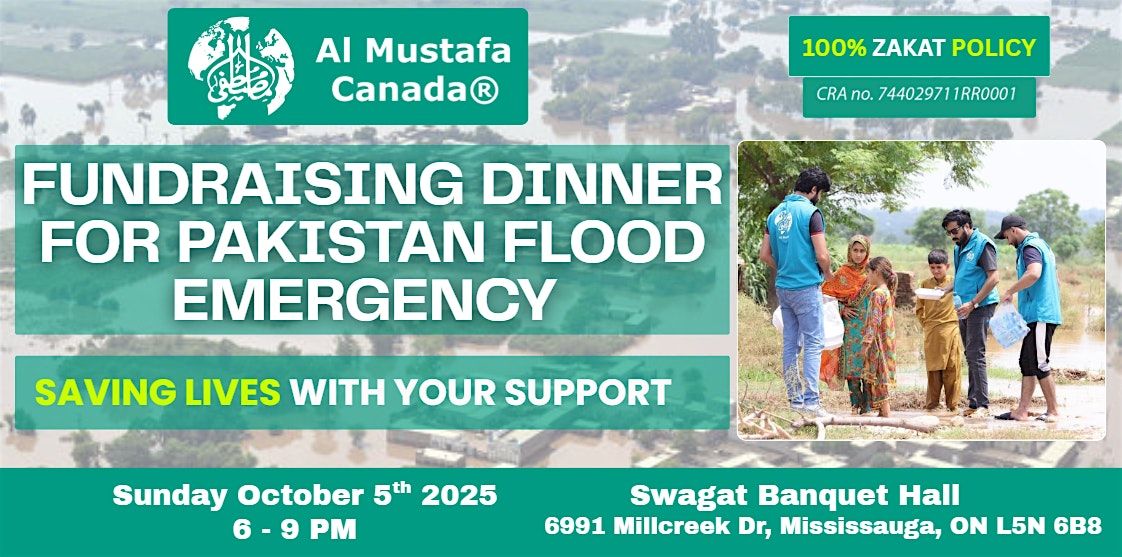 Join us to support Al Mustafa Canada's essential flood relief efforts in Pakistan. Your contributions will help provide food, shelter, Medic*tion and hope to families in need.