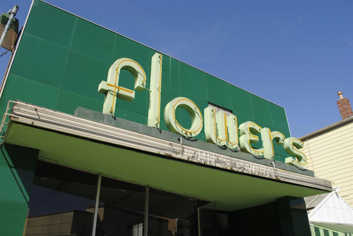 On the sidewalk in front of the John S. Towata FLOWERS sign. | Alameda, CA