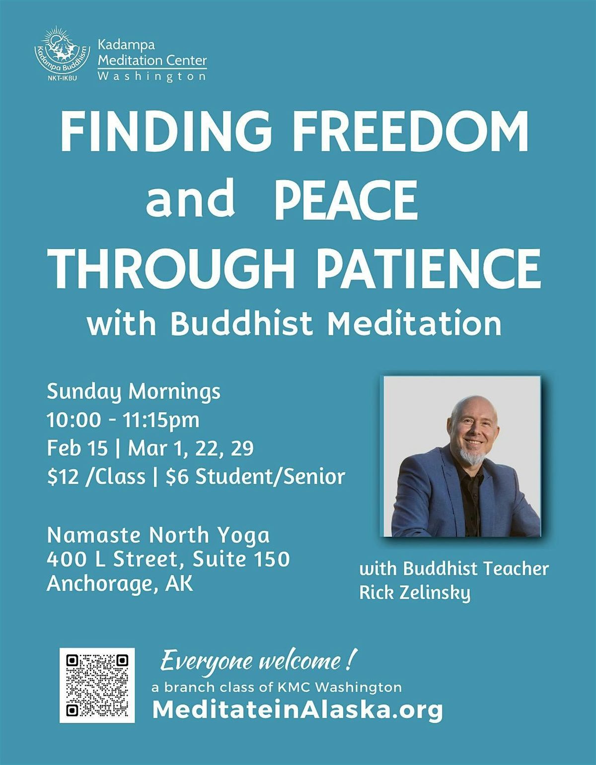 Meeting time is 10am-11:15am. MeditateInAlaska.org is a branch of the Kadampa Meditation Center Washington ( www.Kadampa.org and www.meditateinseattle.org ). We meet three Sundays a month September through May in the beautiful Namaste North Yoga and Wellness studio. Most of us meditate in chairs but you are welcome to sit on the floor with your cushion.