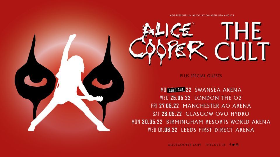 Two acclaimed headliners from both sides of the Atlantic will be touring UK arenas in what will be 2022’s must-see event.Rock n Roll Hall of Famer Alice Cooper returns to the UK alongside Rock Icons The Cult. Renowned for their unforgettable live shows, we can anticipate a dark, twisted trip through goth, psychedelia, macabre theatre and straight up rock anthems when these two giants take the stage.