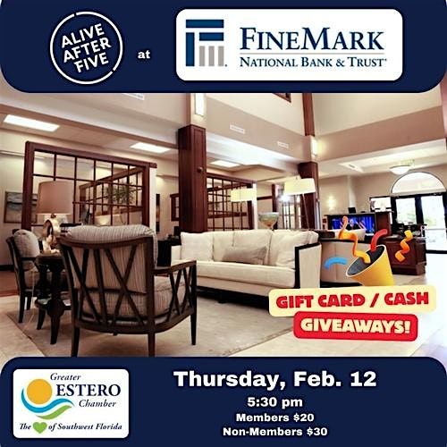 Enjoy great conversation, and meet new peers at Alive After Five! at FineMark Bank on Thursday, February 12, 2026. From 5:30 - 7:00 pm! Mix and mingle with your colleagues in the greater Estero business community. You might even win one of our gift card or cash giveaways!