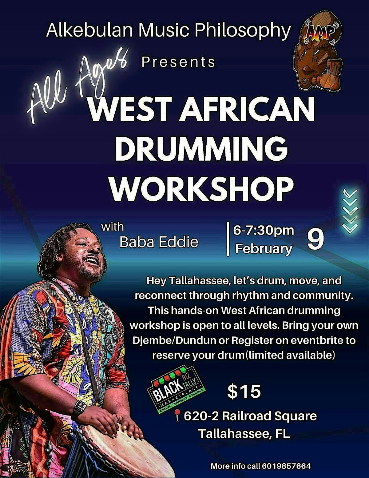 Hey Tallahassee, let's drum, move, and reconnect through rhythm and community. This hands-on West African drumming workshop is open to all levels.