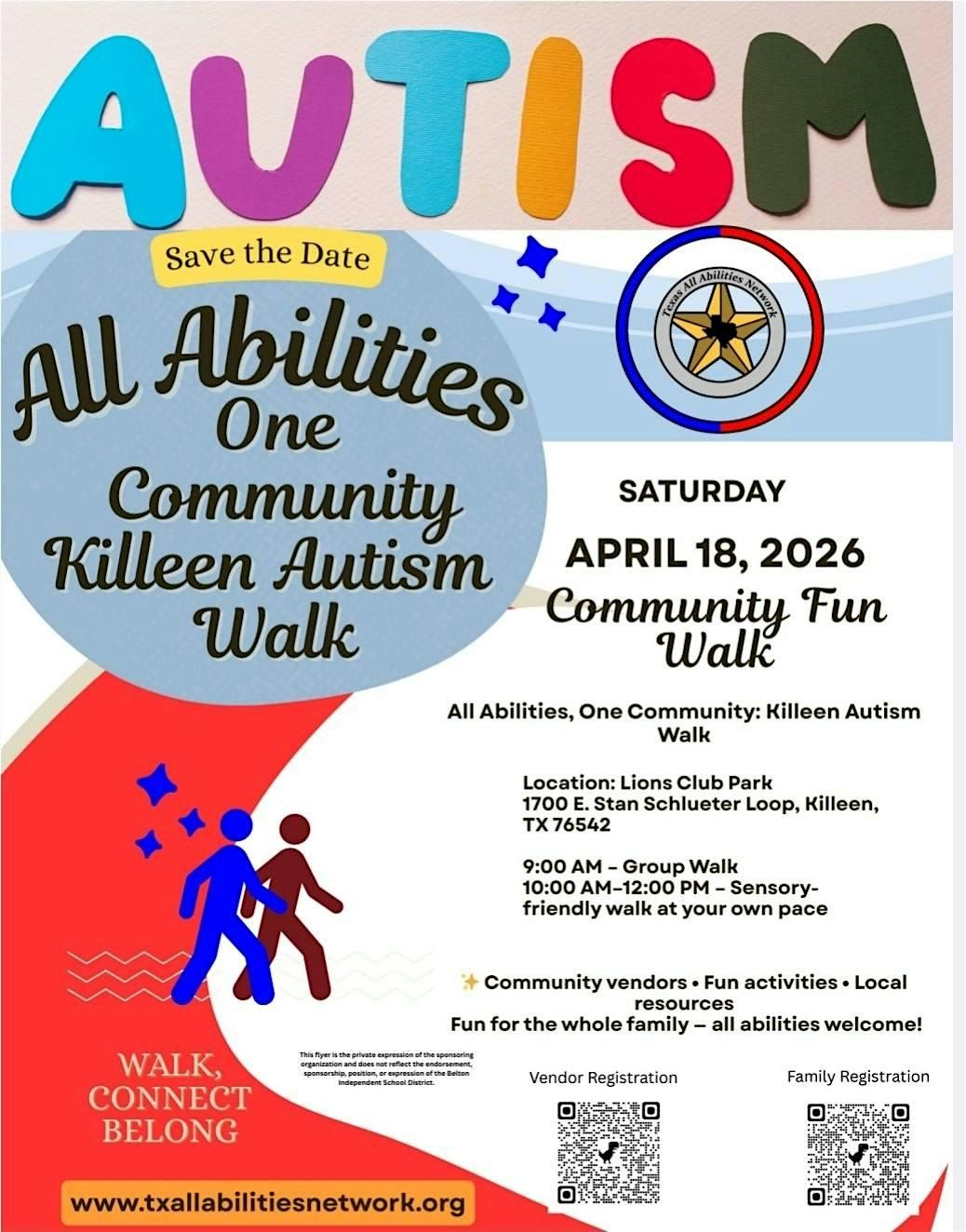 Join us in person for a fun and meaningful day at the Killeen Autism Walk! Celebrate diversity, raise awareness, and support our amazing community. It’s all about coming together with all abilities to make a difference. Bring your friends, family, and good vibes—let’s walk, connect, and inspire each other!