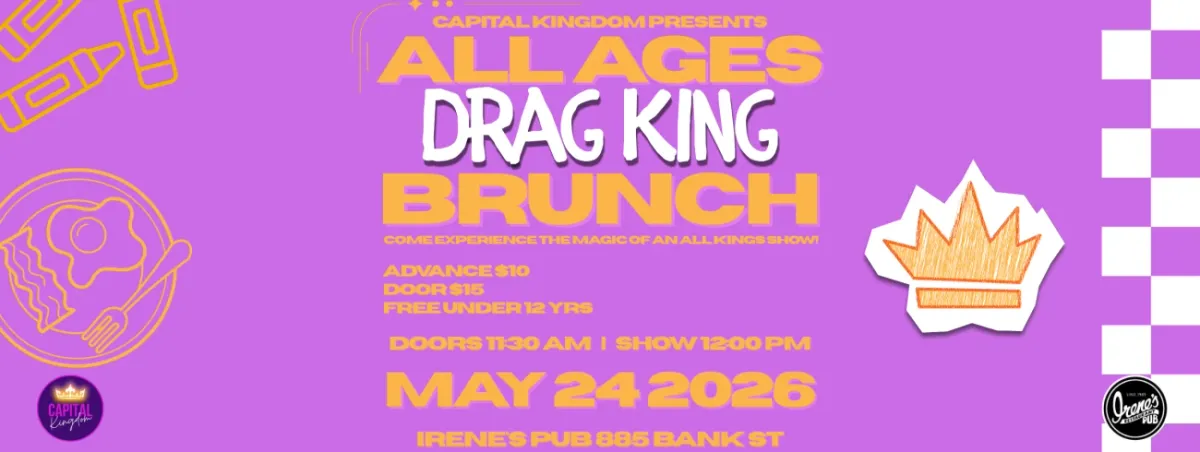 👑 Capital Kingdom presents All Ages Drag King Brunch: May 2026 Edition They say April showers bring May flowers. Well, we're in luck because our May show's cast members definitely deserve all their flowers! Celebrate the start of spring with us with another edition of Capital Kingdom's All Ages Drag King Brunch.🗓️ Date: Sunday May 24, 2026📍 Location: Irene's Pub @irenespub⏰ Doors at 11:30 am | Show at 12:00 pm🎟️ Ticket: $10 in advance | $15 at the door | Free for 12 years and underSubject to availabilityPLEASE NOTE: kids 12 years and under will still require a ticket for capacity requirementsAll tickets are General Admission. Non-refundable.Seating is not guaranteed. Please come early to get a good seat.(The venue provides a ramp outside and a washroom located on the main floor. Other washrooms on the lower level. If ramp is needed please advise in advance, if possible)