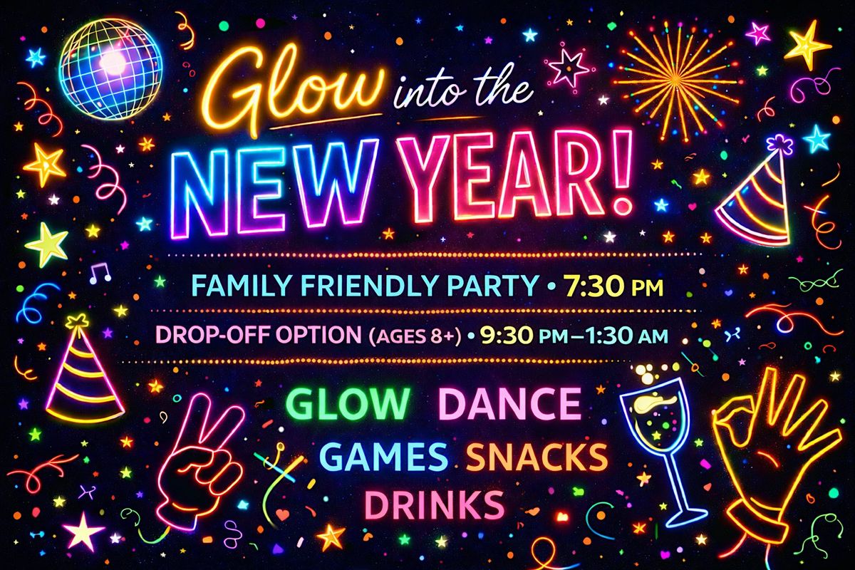 Join us for a family-friendly New Year’s Eve party featuring music, dancing, glow vibes