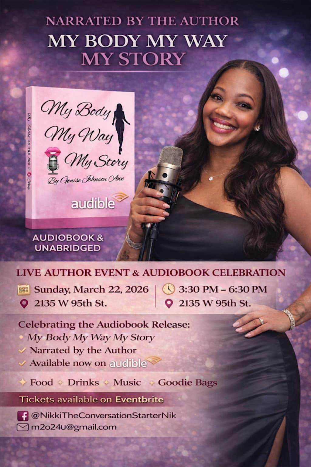 We invite you to participate in an engaging silent listening event, featuring refreshments, entertainment, and networking opportunities. A donation of $15 is required for admission. We recommend early ticket acquisition and timely arrival. The event will take place at the Beverly Hill Art Gallery, with street parking readily available. Please note that the event will commence promptly, and doors will be closed between 4:30 PM and 5:15 PM for the narration of the book "My Body, My Way, My Story."
