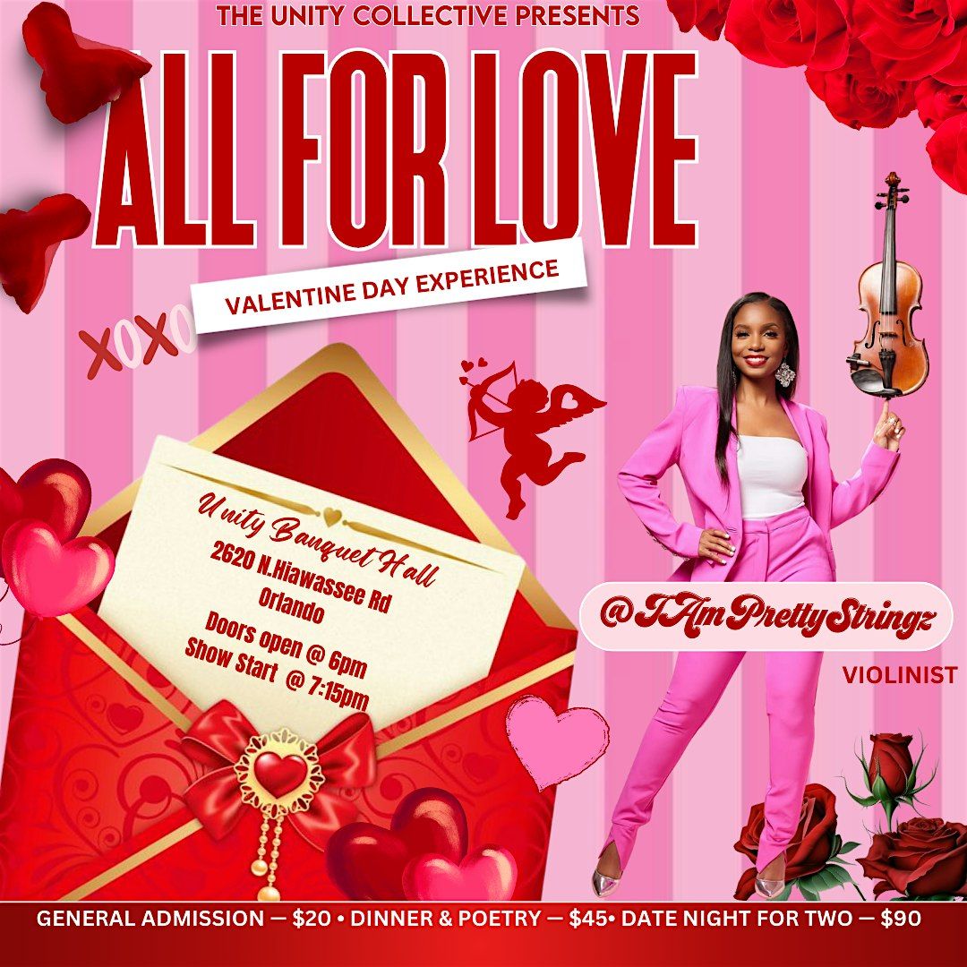 Welcome to the All for Love Music Concert with live poetry and performances at Unity Banquet Hall LLC! Join us on February 15, 2026 at 6:00 PM for a night filled with love art and food . Get ready to be mesmerized by talented musicians, poets, and performers. Let the music and poetry touch your soul and make your heart dance. Don't miss this opportunity to experience a magical evening surrounded by love and creativity. See you there!
