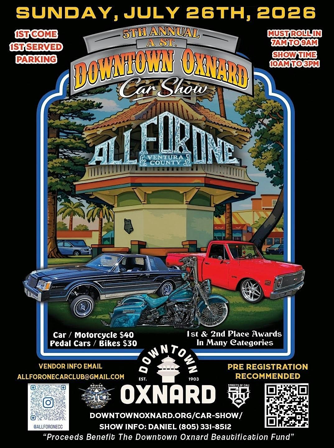 $40 registration for show cars and motorcycles. Professional judging with prizes in seven categories. Proceeds benefit the Historic Downtown Oxnard Beautification Fund. Register Now.