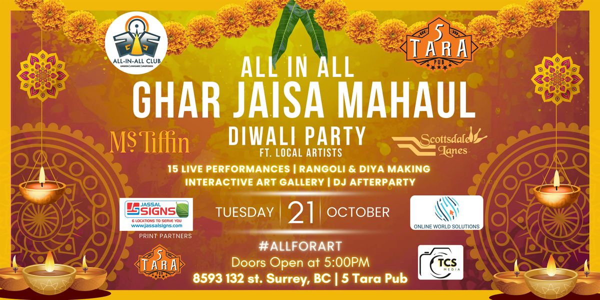Join us for a heartwarming night of lights, live performances, and local flavor at the All In All – Ghar Jaisa Mahaul: Diwali Party! From music and poetry to interactive art and dance, this event brings the true spirit of Diwali alive — loud, vibrant, and rooted in community.