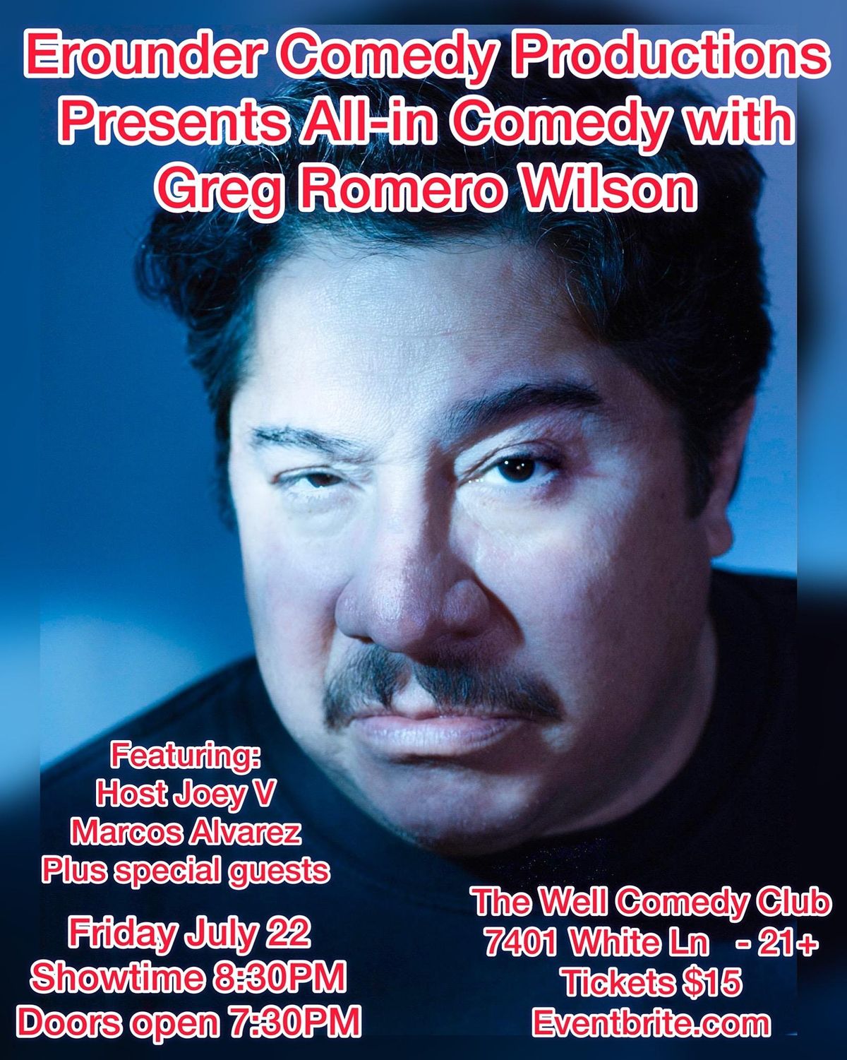 Erounder Comedy Productions presents All-in Comedy with Greg Romero Wilson plus special guests, Friday July 22 8:30PM at The Well Comedy Club.