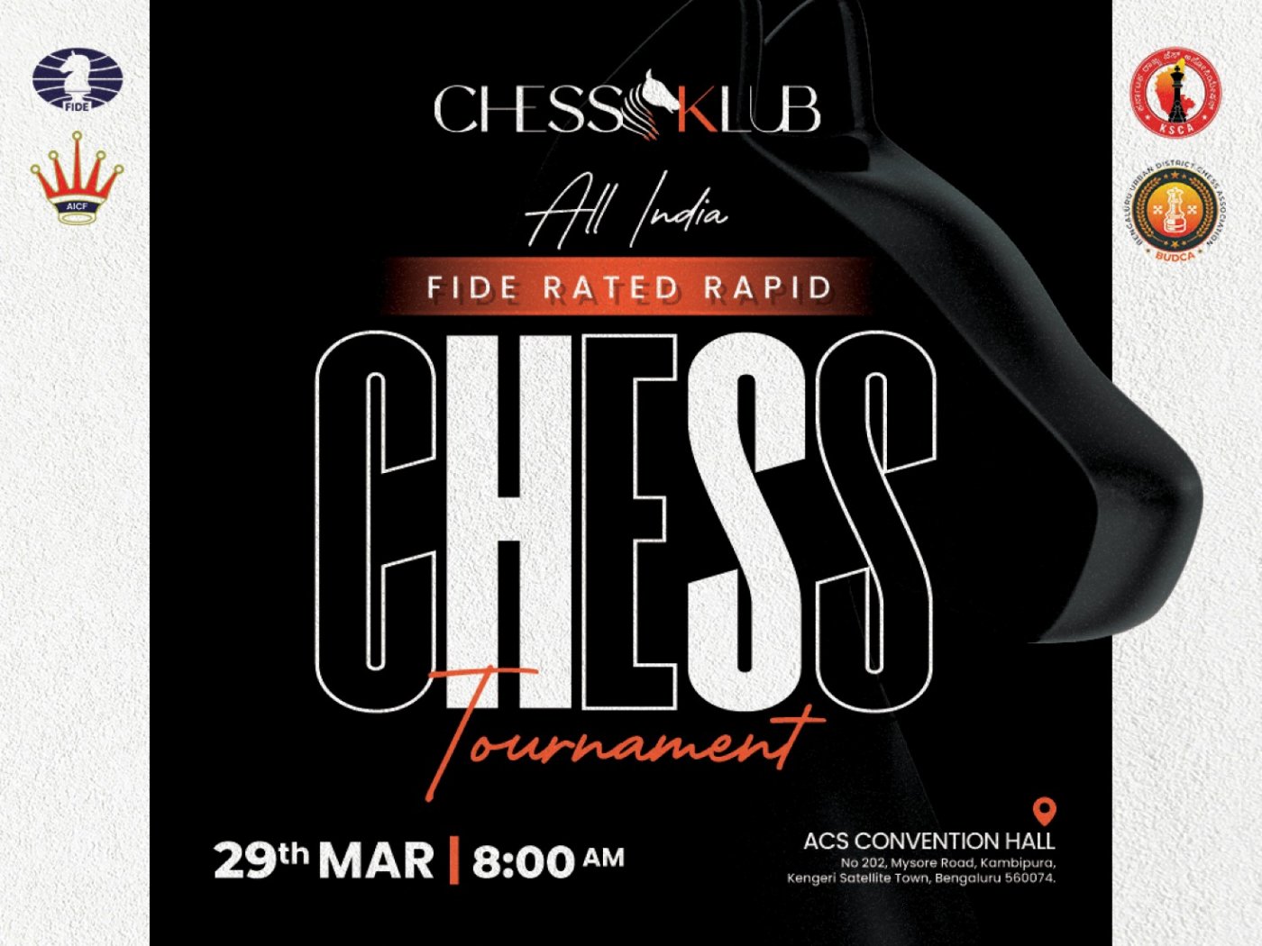 Join CHESS KLUB for one of Bengaluru’s most prestigious chess events on March 29, 2026. Held at the ACS Convention Hall, this FIDE-rated tournament is a premier platform for players to test their skills, gain international ratings, and compete for a significant Cash Prize Fund of ₹2,00,000.