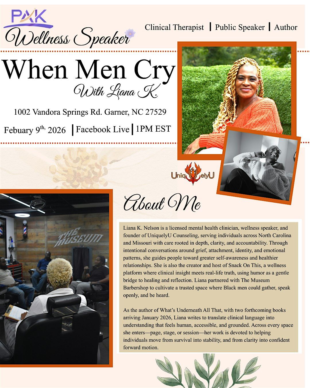 Join us for an inspiring in-person event where we dive deep into the power of vulnerability and emotional wellness. Liana K leads an open, judgment-free space to explore why it’s okay to express feelings. Come connect, share, and break the stigma around emotions. Don’t miss this chance to heal and grow together!