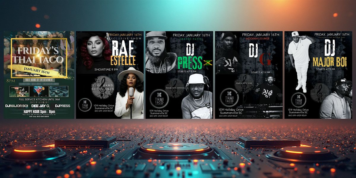 All New Friday's debut at Thai Taco! Three rooms of entertainment. Rae Estelle performs live with the band. DJ Major Boi, DJ G, and DJ Press will be bringing the heat at 9 PM. Happy Hour 5-8PM. Full service kitchen until 1AM. Heated patio, bar & stage, R&B hookah lounge starts at 9PM.