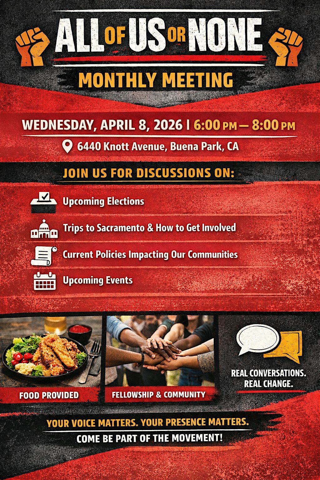 Join us on April 8 for our monthly **All of Us or None** meeting! We’ll be diving into the upcoming election, sharing updates from our trips to Sacramento and ways to get involved, discussing current policies, and highlighting upcoming events. Come for the fellowship, stay for the food, and be part of meaningful conversations that drive change.