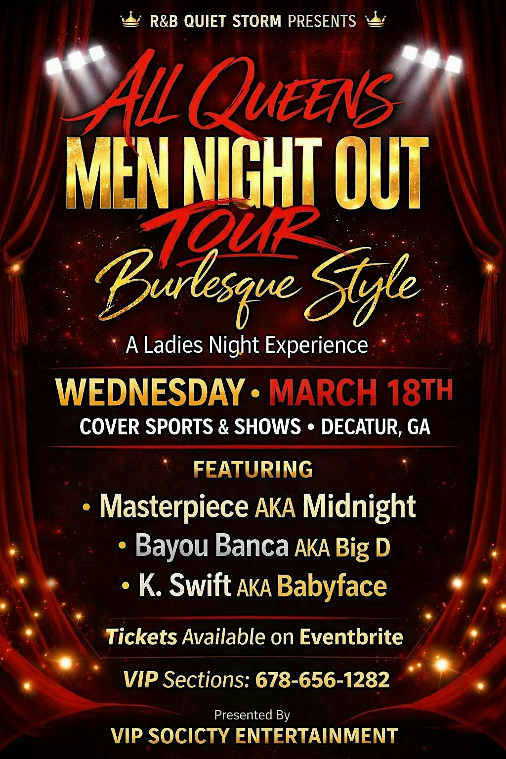 All Queens Men Night Out Tour: Burlesque Style is an exciting ladies night experience bringing smooth vibes, entertainment, and high-energy performances to Atlanta.