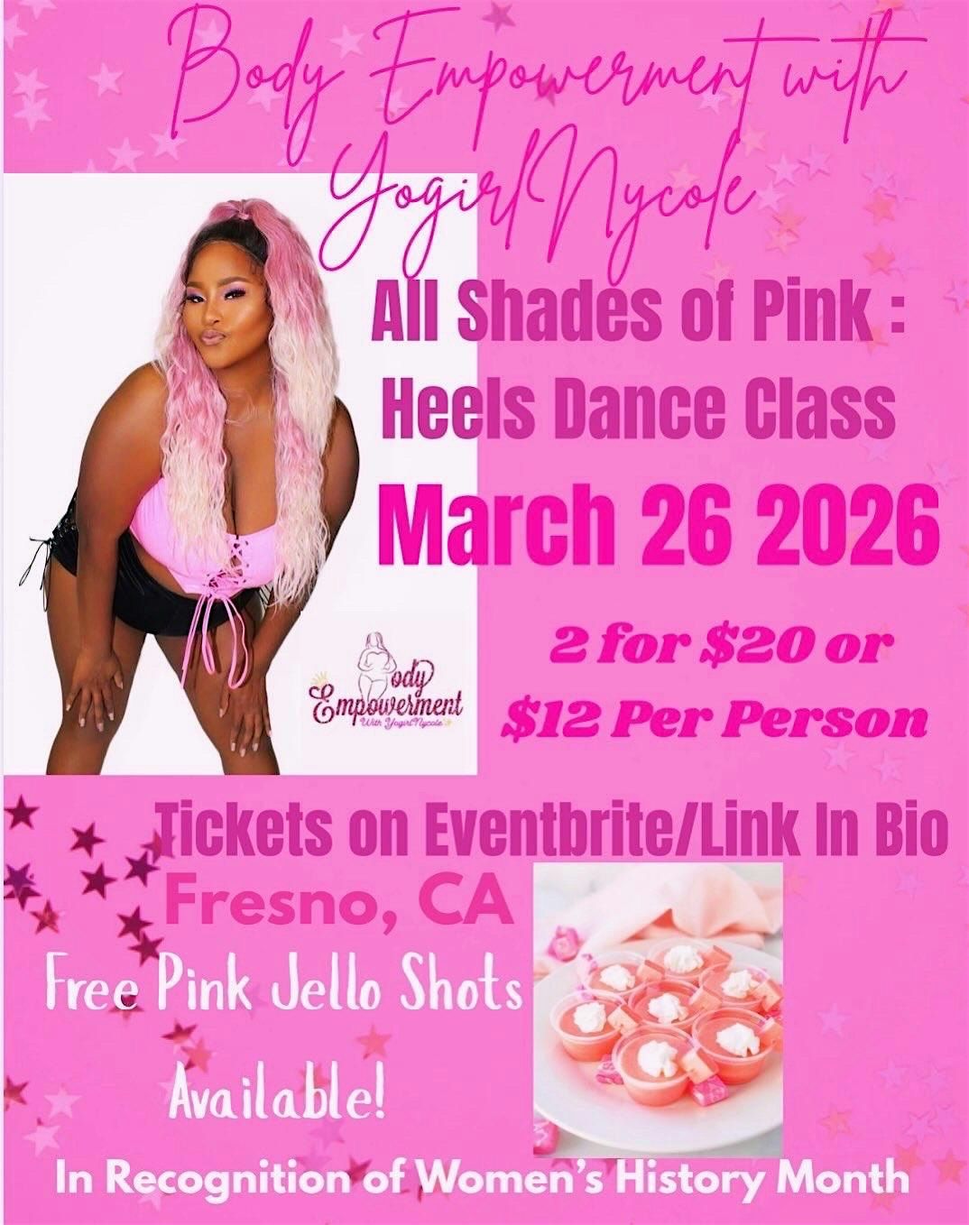 Get ready for All Shades of Pink, Heels Dance Class! Wear your favorite pink outfit and join us for a day full of DANCE & SELF CARE. Don’t miss out—let’s Celebrate Women's History month together & Get a free pink Jell-O shot!!