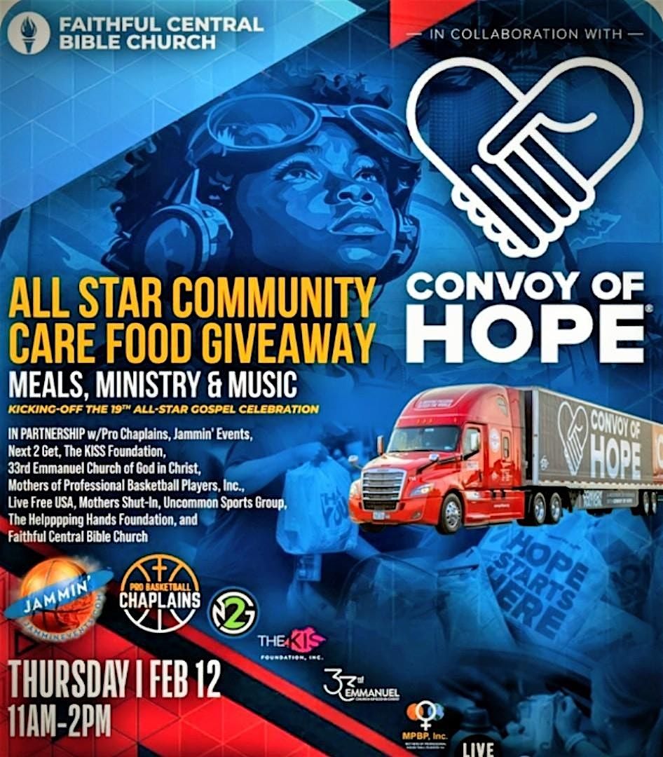 The All Star Community Care Food Giveaway. Meals Ministry & Music. This drive through ONLY food distribution will distribute the equivalent of two bags of groceries to those who are registered. The current event sponsors are Convoy of Hope, Pro Chaplins, Jammin Events, Next 2 Get, The Kiss Foundation, 33rd Emmanuel COGIC, Mothers of Professional Basketball Players, Inc., Live Free USA, Mothers Shut-In, Uncommon Sports Group, The Helpppping Hands Foundation & Faithful Central Bible Church.