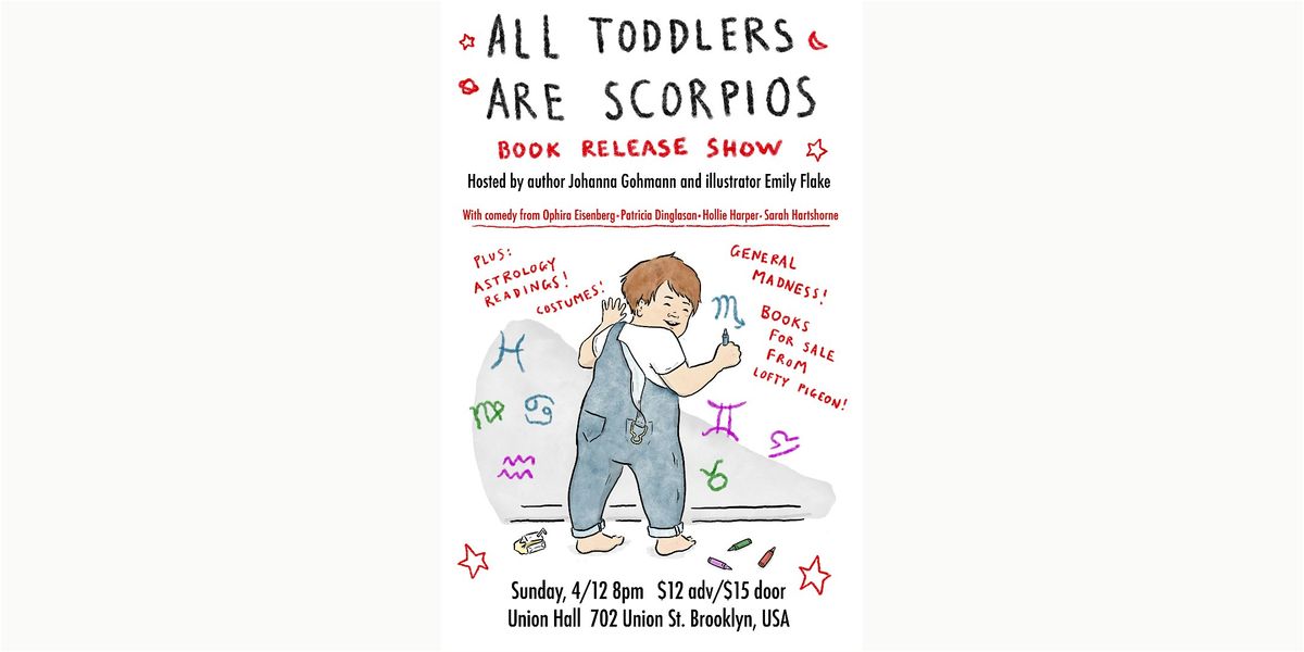 Come celebrate the release of All Toddlers are Scorpios with author Johanna Gohmann (McSweeney’s) and illustrator Emily Flake (New Yorker)! Featuring comedy from Ophira Eisenberg, Hollie Harper, Patricia Dinglasan, and Sarah Hartshorne, plus astrology reading, costumes, and general mayhem. Books available for sale from bookseller Lofty Pigeon.