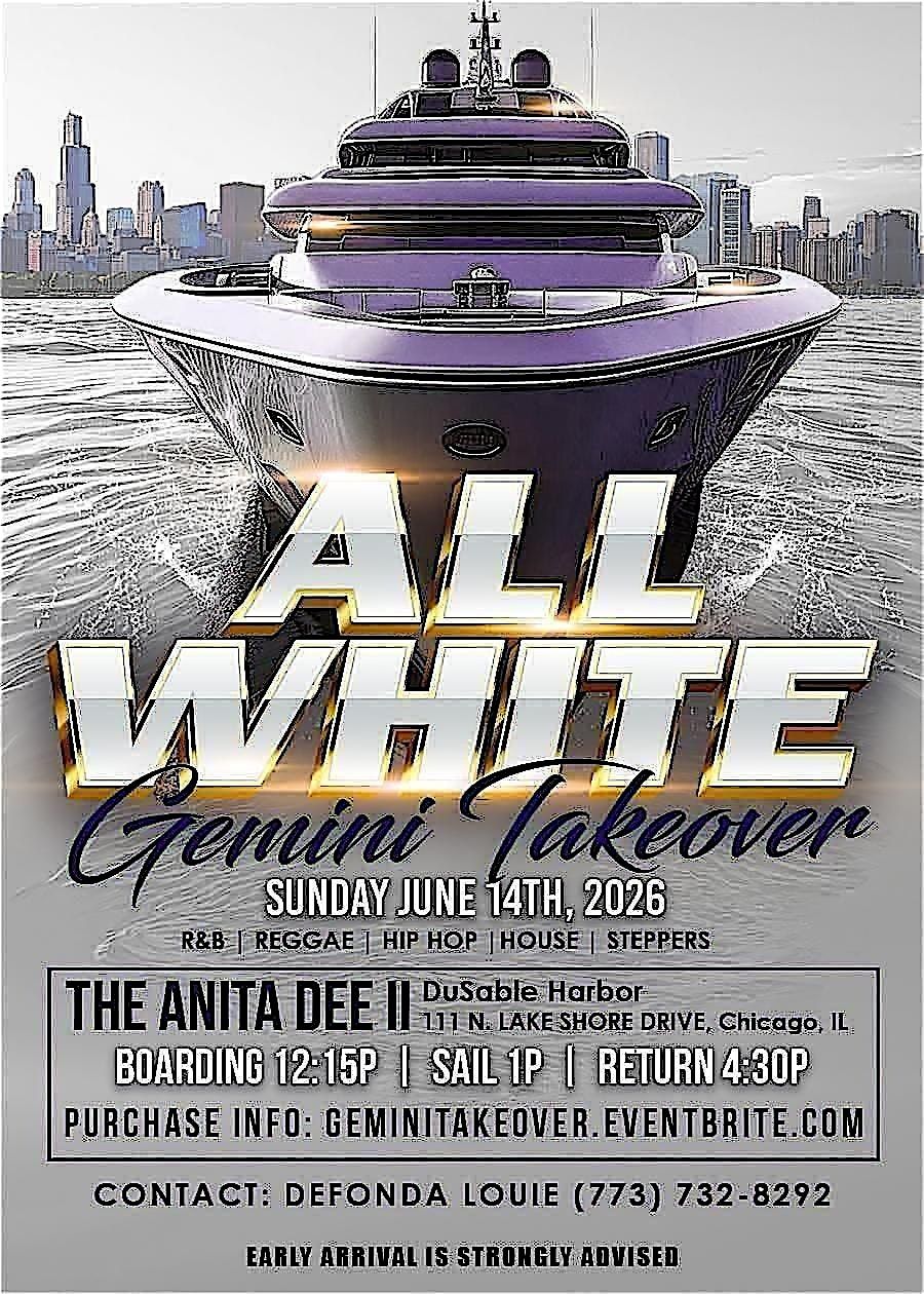 All aboard the Luxirious Anita Dee II Yacht for an afternoon of fun in the sun, while you take in the beautiful breathtaking views of the Chicago skyline. Music will be provided by Chicago's hottest DJ's. So come ready to have a great time. All White attire is not mandatory but suggested.