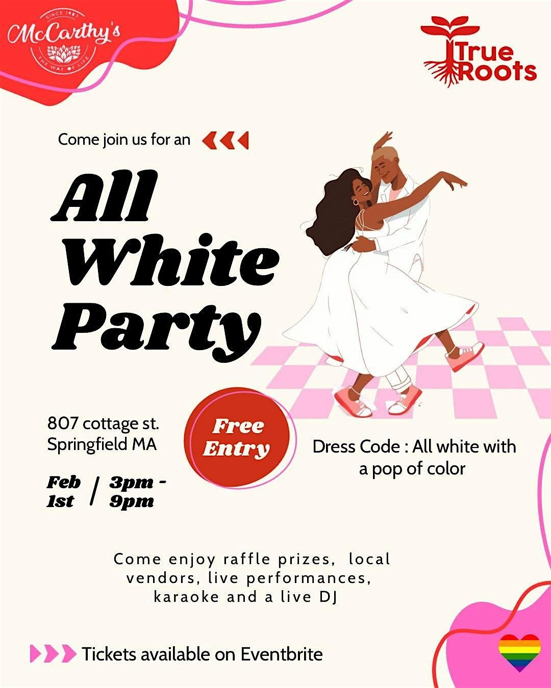 Welcome to the True roots **All White Party** at Mccarthy's *! Get ready to dance the night away in your best all white outfit wiith a splash of color**February 1, 2026 at 3:00 PM (Eastern Time). It's going to be a night to remember filled with great music, delicious drinks, raffel prizes live local artist and amazing company. Don't miss out on this epic event - mark your calendars now!