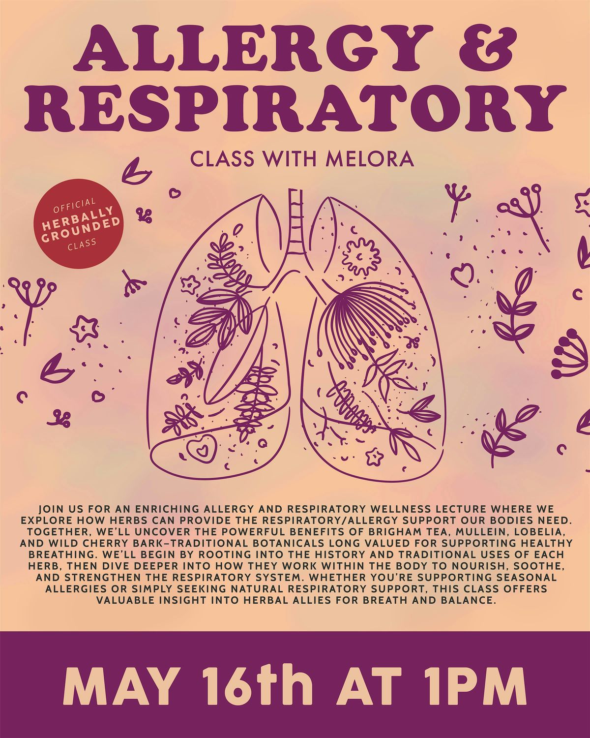 Welcome to Allergy & Respiratory Health Class at Herbally Grounded! Join us on May 16, 2026 at 1:00 PM for an interactive session on improving your respiratory health. Learn about natural remedies, breathing exercises, and more to help manage allergies and respiratory issues. This class is perfect for anyone looking to enhance their well-being in a holistic way. Don't miss out on this opportunity to take control of your health! See you there!