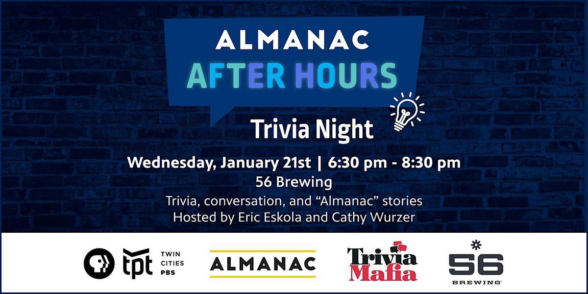 Celebrate "Almanac” on Twin Cities PBS with a night of smart, spirited competition in partnership with Trivia Mafia at 56 Brewing in Minneapolis. Join fellow superfans to test your Minnesota knowledge and compete for the coveted title of "Almanac Trivia Champion."