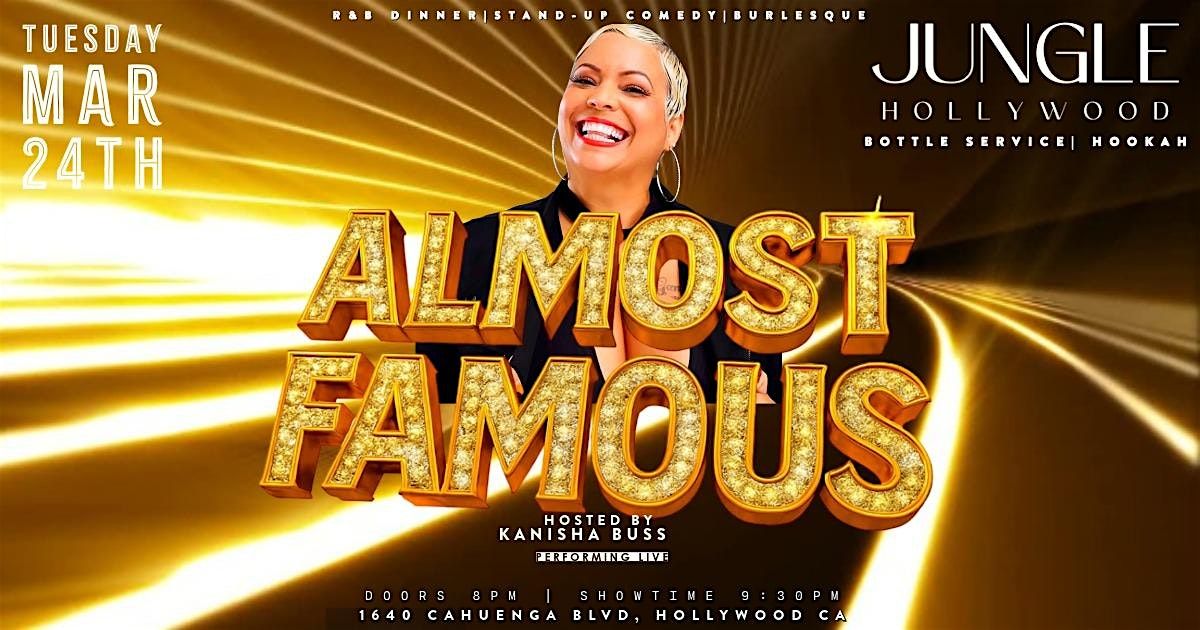 Welcome to the Almost Famous Comedy Show at Jungle Hollywood! Get ready for a night filled with hilarious standup and improv comedy. Join us on March 24TH, 2026 at 8:00 PM (Pacific Time) for a laughter-packed evening you won't forget. Bring your friends and family for a great time together. See you there!