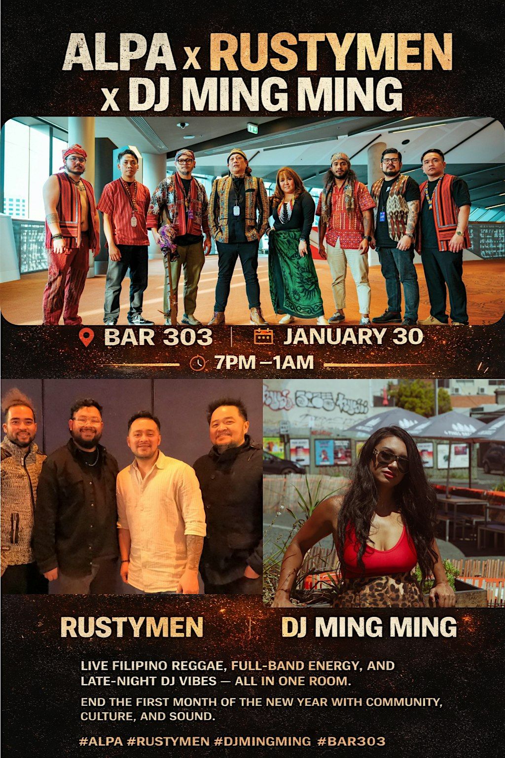 ALPA x Rustymen x DJ Ming Ming come together for a night of live Filipino reggae, full-band power, and late-night DJ rhythms.