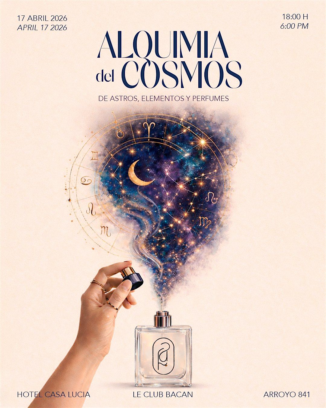 A través de una degustación olfativa especialmente diseñada, la experiencia propone descubrir el lenguaje invisible del perfume y su conexión con la identidad personal. Cada participante será invitada a interpretar su esencia y a crear un perfume propio, inspirado en su signo y en su energía, una fragancia única que podrá llevarse consigo como recuerdo de este encuentro.