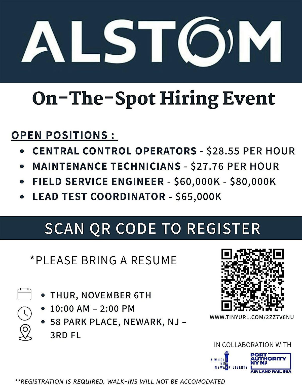 ALSTOM is holding a Microjob Fair at the Newark Outreach Office, hosted by the Port Authority of NY&NJ on behalf of the EWR Redevelopment Program.