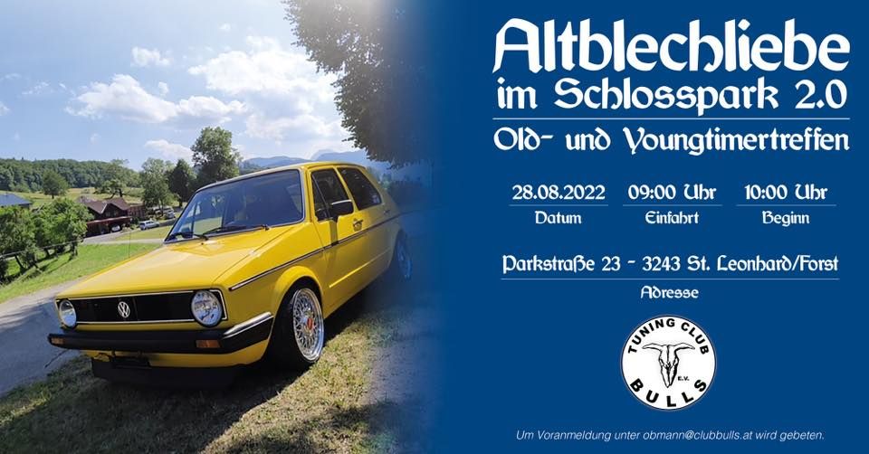 Altblechliebe im Schlosspark 2.0Hierbei geht es am Sonntag, dem 28.08.2022 im traumhaften Ambiente des Schlossparks St. Leonhard am Forst in die 2. Runde des Old- und Youngtimertreffens.