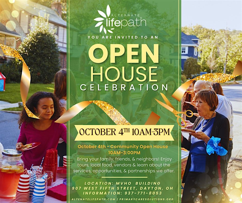 Join us at Alternate Life Path's Open House Community Celebration! Alternate Life Path in partnership with Primary Care Solutions cordially invites our neighbors, schools, clients and friends, to celebrate with us. Discover what we do as a community focused mental health organization. Meet our staff, community partners, and discover new opportunities to strengthen yourself and family. The event will be held at our new location, 907 W. 5th St. Don't miss this exciting opportunity to explore what we are doing in Dayton! Free food and engagemnt. Bring the family!