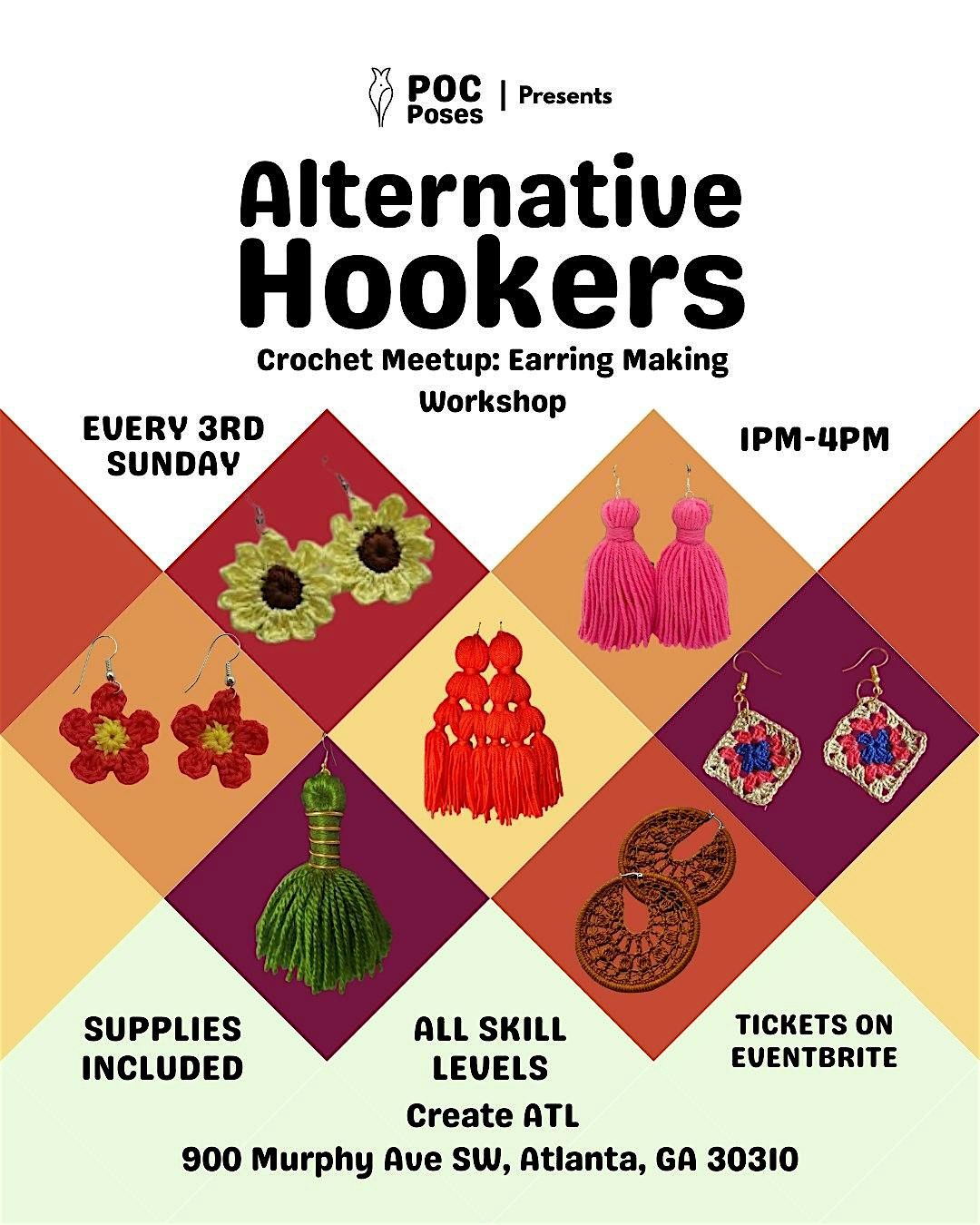 Join us Every Third Sunday at 1pm-4pm for Alternative Hookers, a crochet meetup for all skill levels in Atlanta. This hands on crochet earring workshop is for complete beginners looking for a new hobby and experienced crocheters who want to meet other alt creatives and build community through fiber art.