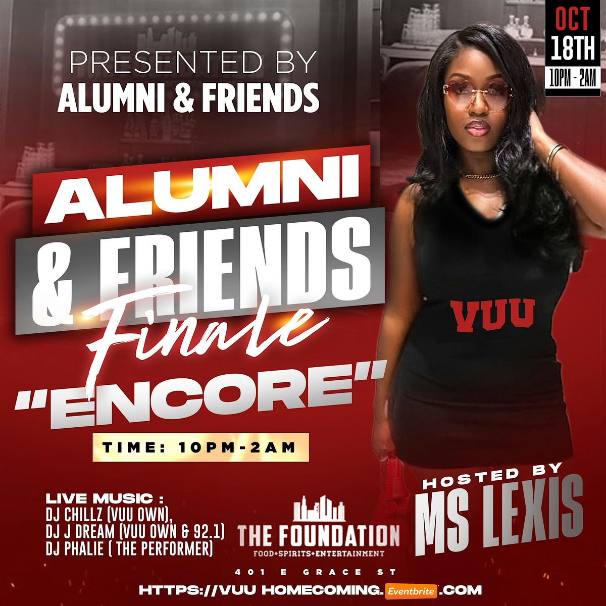 Welcome to the Alumni & Friends Finale event! Join us at 401 E Grace St on October 18, 2025 at 10:00 PM (Eastern Time) for a night of celebration and reminiscing with old friends and fellow alumni. Let's make this a night to remember as we catch up, share stories, and create new memories together. Don't miss out on this opportunity to reconnect and have a great time! We can't wait to see you there!