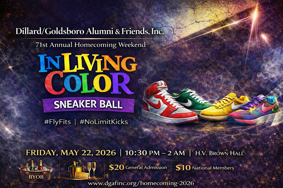 Welcome to the Dillard/Goldsboro Alumni Sneaker Ball – #InLivingColor, where Grown & Fly meets Courgar & Tiger Pride. Pull up on Friday, May 22, 2026 at 10:30 PM (ET) at the H.V. Brown Center for a night you don’t want to miss.