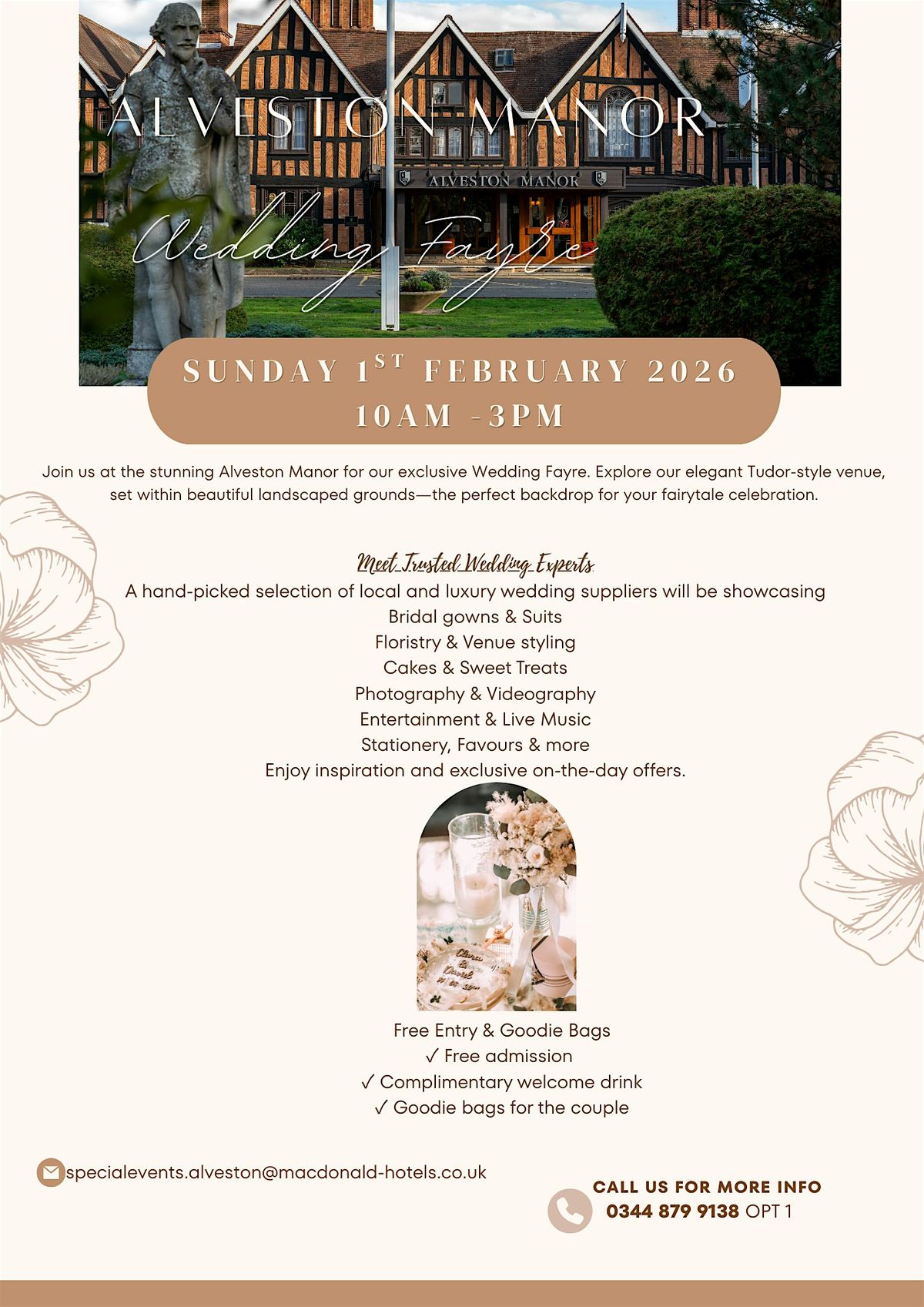 Looking for wedding inspiration? Join us at the Alveston Manor Wedding Fayre — an exciting showcase where loads of fantastic local suppliers will be under one roof to help you plan your perfect day!