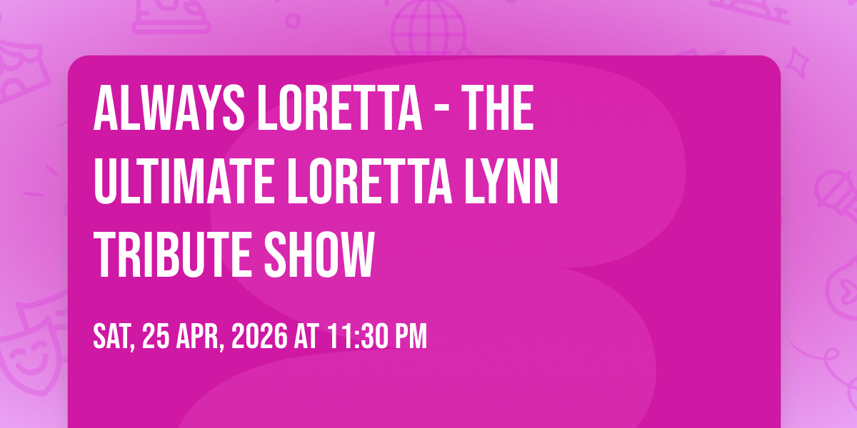 📍 Location: 34.76703, -83.064865🎉 Welcome to Always Loretta - The Ultimate Loretta Lynn Tribute Show, where the impossible becomes possible and dreams take flight! 🏛️ Join us at Walhalla Performing Arts Center in the heart of Walhalla, SC for an event that will redefine your expectations. 📅 On April 25th, 2026 at 11:30 PM, witness the transformation of space and time into something truly magical. ✨ It's a curated experience combining the best of innovation, entertainment, and community spirit, creating moments that will be remembered for years to come. Whether you're a first-time visitor or a seasoned enthusiast, prepare to be amazed. 🎊 Book now to ensure your place in this unforgettable experience!