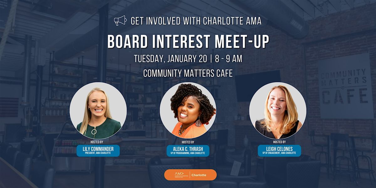 Join us for a Board Interest Meeting at Community Matters in Charlotte and discover how you can step into leadership with the American Marketing Association Charlotte Chapter. This casual after-work meet-up is designed for marketing professionals who want to expand their network, give back to the community, and sharpen leadership skills.