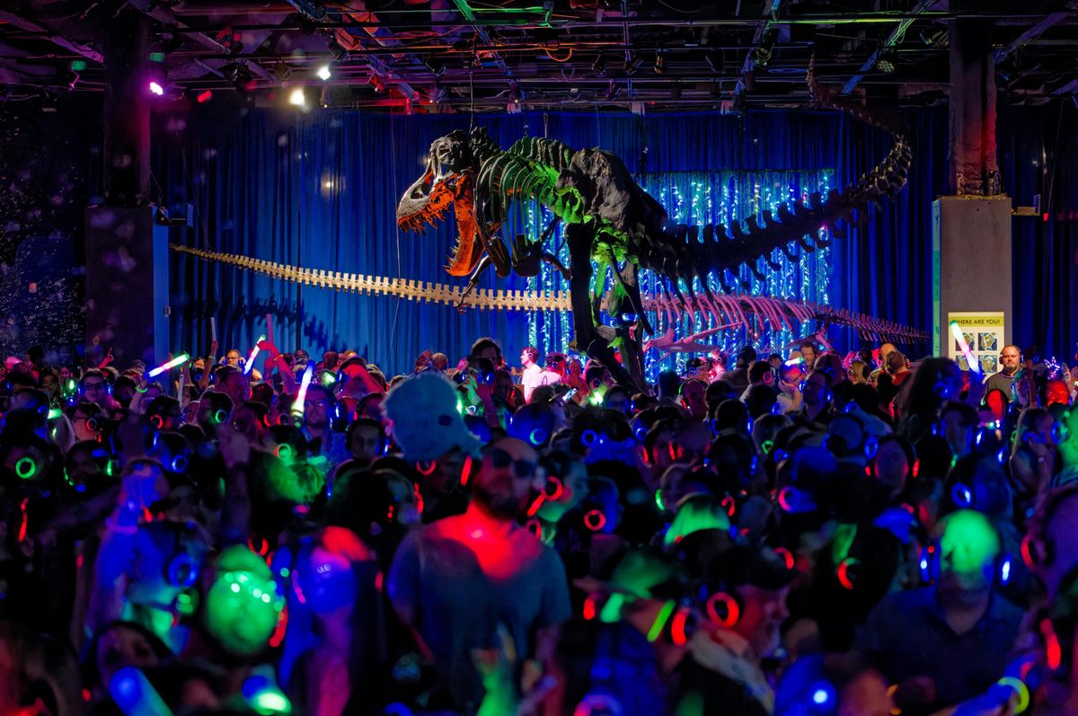 🦖Party in the exhibition space under a giant, illuminated T-Rex Skeleton