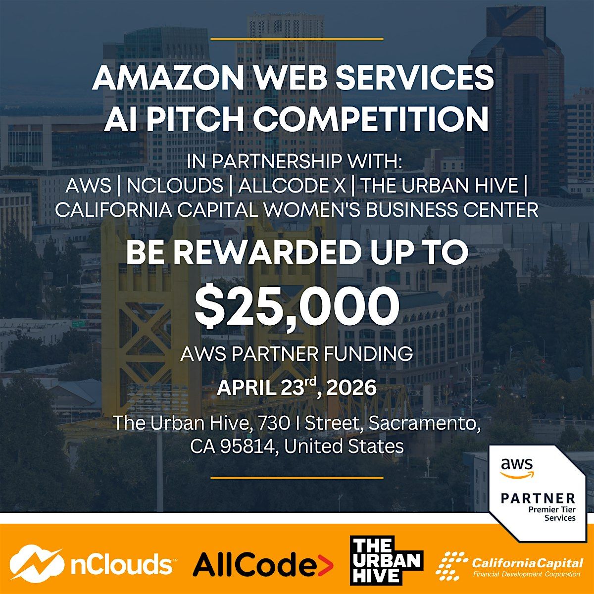 The Amazon Web Services's AI Pitch Competition, in partnership with AWS, nClouds, AllCode, and the California Capital Women’s Business Center, This competition brings together founders and innovators building the next generation of Artificial Intelligence solutions. It is designed to support organizations leveraging AI, Generative AI, Agentic AI, machine learning, and advanced data technologies to solve real-world business and industry challenges.