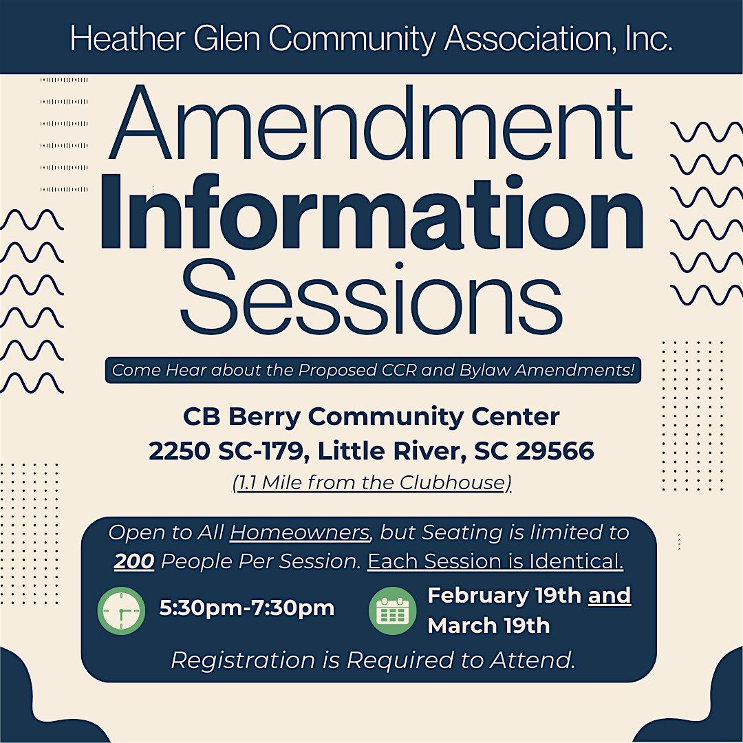 Come hear about the Proposed CCR & Bylaw Amendments! Open to All Homeowners, but seating is limited to 200. Each Session is Identical.