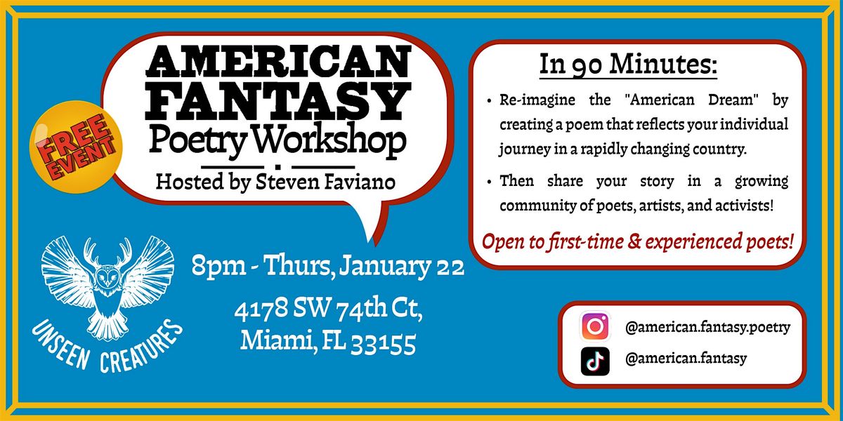 Hosted by Steven Faviano, the American Fantasy Poetry Workshop & Open Mic is a unique community experience where poets, artists, and activists can express their stories. During the 90-Minute session, we will spend time drafting, refining, and sharing poems reflecting our individual journeys in modern America.